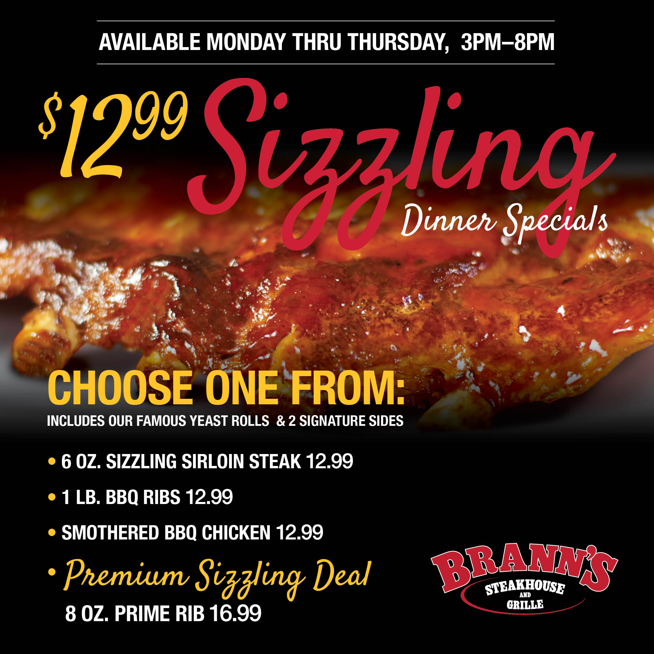 Sizzling Dinner Specials for $12.99 on Mondays through Thursdays, 3pm-8pm at all locations. Now includes our Premium Sizzling Deal 8oz. Prime Rib $16.99.