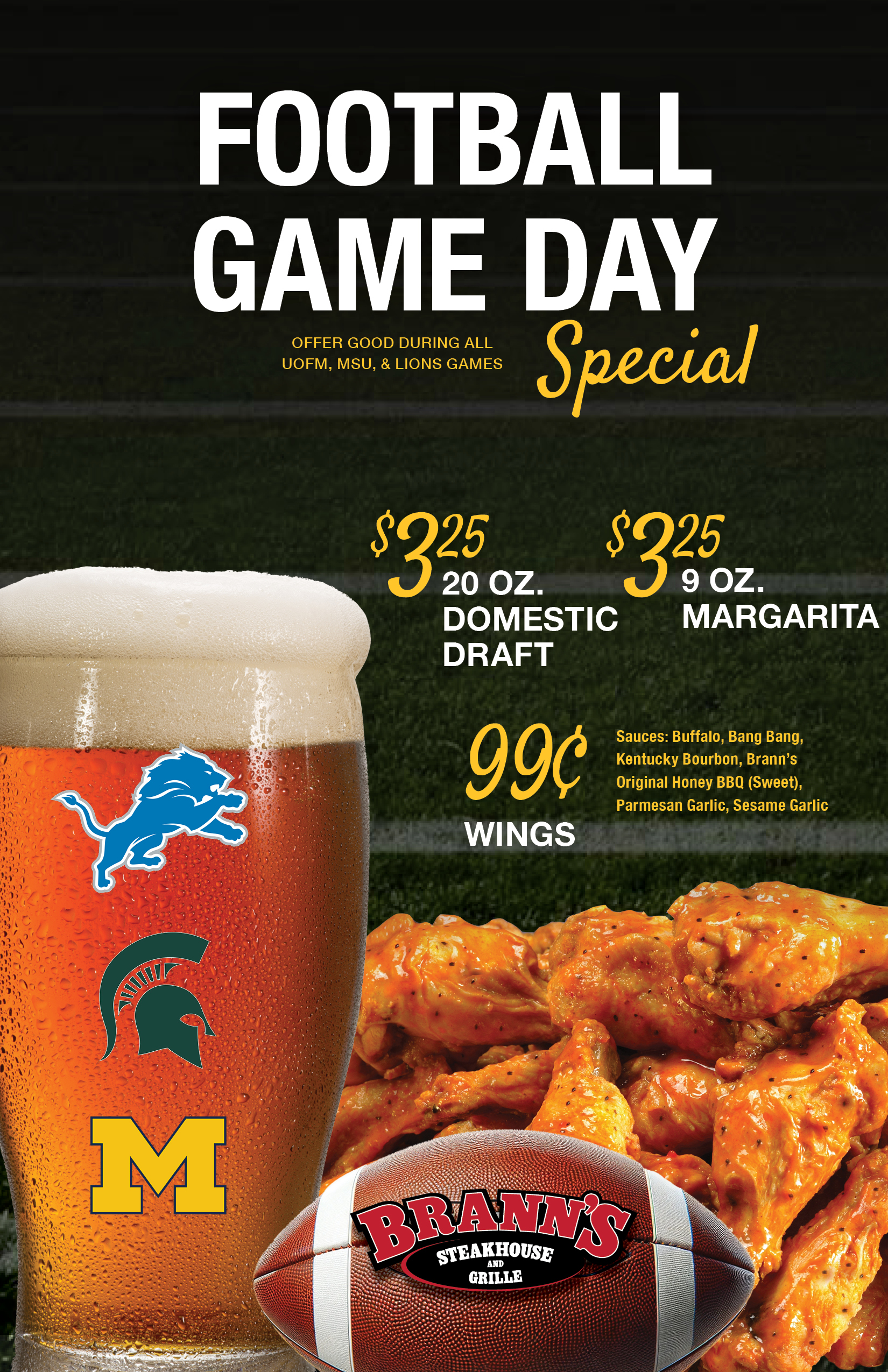 Football is back! Stop in during any UofM, MSU, or Lions games for $3.25 drafts, 99 cent Wings and of course $3.25 9 oz. Margaritas.