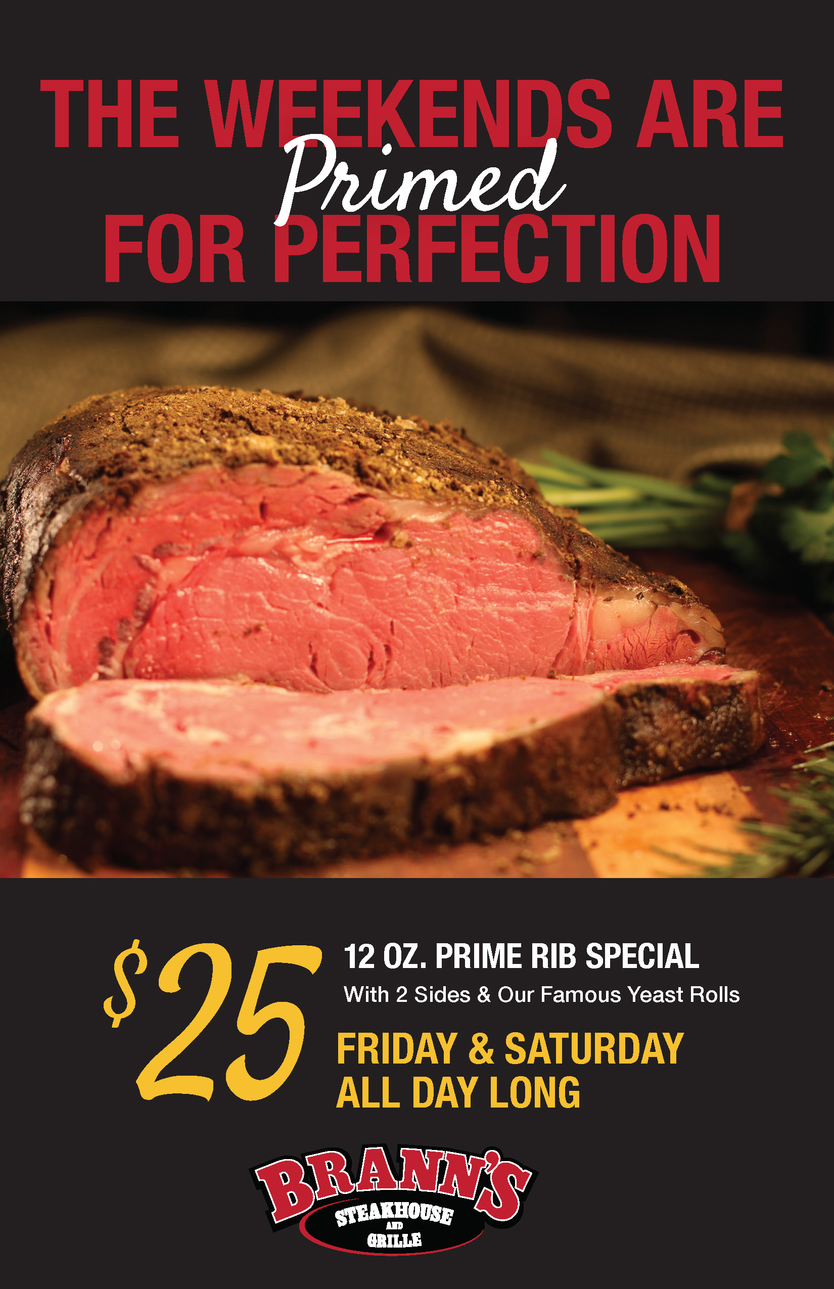Weekend Special. 12 oz. Prime Rib $25. Includes 2 sides and our famous yeast rolls. Available on Fridays and Saturdays, all day long.